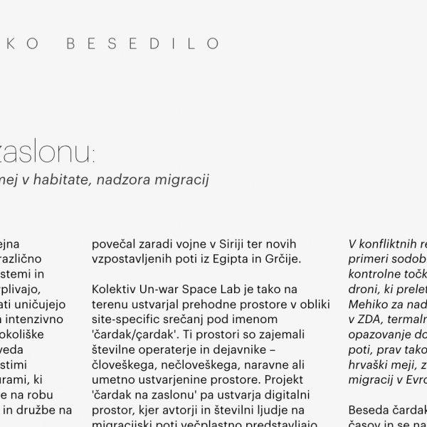 Državni mejni sistemi in obmejna infrastruktura so širom sveta različno organizirani in zastopani. Ti sistemi in infrastruktura opredeljujejo, vplivajo, manipulirajo, nadzirajo in hkrati uničujejo človeška življenja, hkrati pa intenzivno vpisujejo zgodovino nasilja povezanega z migracijami v okoliške pokrajine. To zgodovino seveda ustvarjajo in hkrati prikrivajo iste (institucionalizirane) strukture, ki skušajo utišati različne glasove na robu naših geopolitičnih prostorov in družbe na splošno. Kolektiv Un-war Space Lab je tako na terenu ustvarjal prehodne prostore v obliki site-specific srečanj pod imenom čardak / çardak. Ti prostori so zajemali številne elemente: človeške, nečloveške, naravne ali umetno ustvarjene prostore. Projekt »čardak na zaslonu« pa ustvarja digitalni prostor, kjer avtorji in številni ljudje na migracijski poti večplastno predstavljajo migrantsko problematiko. Tako so skozi čas skupaj ustvarili ta prostor, učenja, pozabljanja (unlearning) in izmenjave različnih vedenj, znanj in informacij.